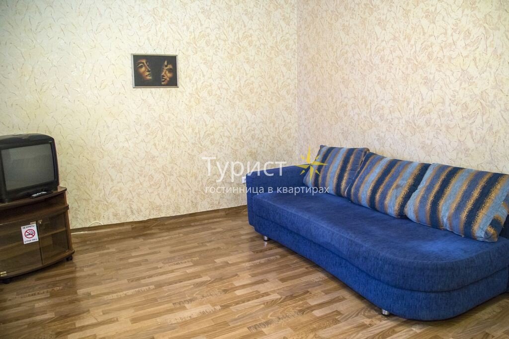 Спальное место – большой раскладной диван, который подарит вам мягкость и проведет в сладкий мир грез. Напротив, на тумбе стоит небольшой телевизор,